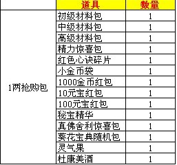 【活动内容】:活动期间内,每日抢购新增1两回馈包,可开出众多抢购道具之一,更有机会开出珍贵道具!