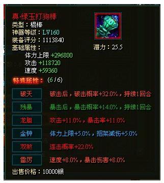 上图中神器属性为160级潜力值为25.5的属性,仅供参考,请各位大侠快快打造属于自己的极品神器吧。