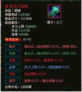 上图中神器属性为160级潜力值为25.5的属性,仅供参考,请各位大侠快快打造属于自己的极品神器吧。】