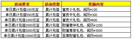 累计充值满2000元宝,奖励盈盈之泪*1、霸王*1