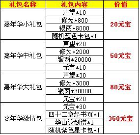累计充值满100000元宝,奖励风清扬名帖*1、清风之扬*1、暗金侠情石*1