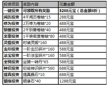 活动规则:活动期间花费5288元宝参与一键投资,即可在接下来的七天内领取总价值约12000元宝的超值道具奖励;同时玩家也可以只参与单项投资,获取相应道具奖励。
