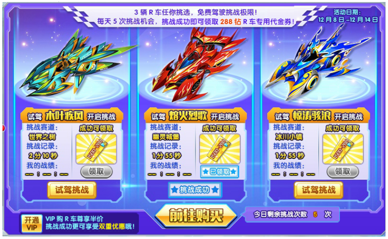 每天5次挑战机会,挑战成功即可领取288钻R车专用代金券!