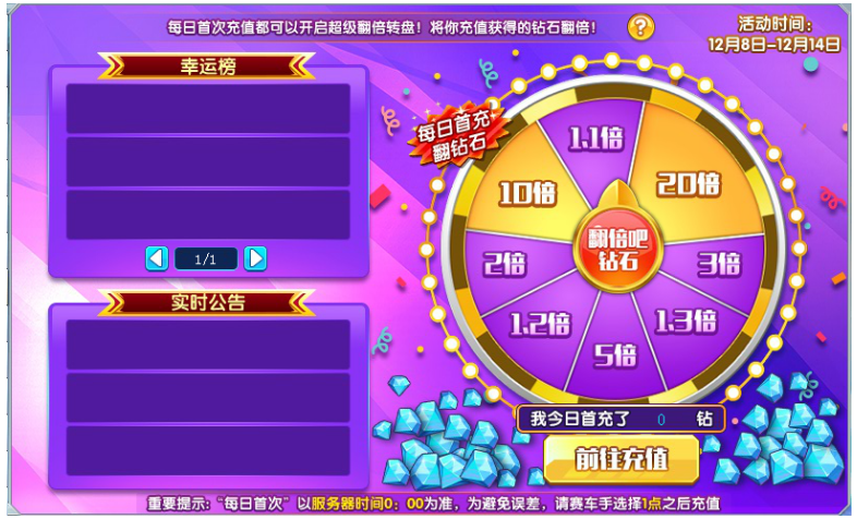 “每日首次”以服务器时间00:00为准,为了避免误差,建议各位赛车手选择1点之后首充哦!