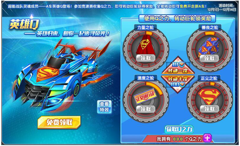 参加竞速赛收集Q之力,即可转动巨轮获得其中奖励,专属头像、披风、车牌和胎痕等你拿!