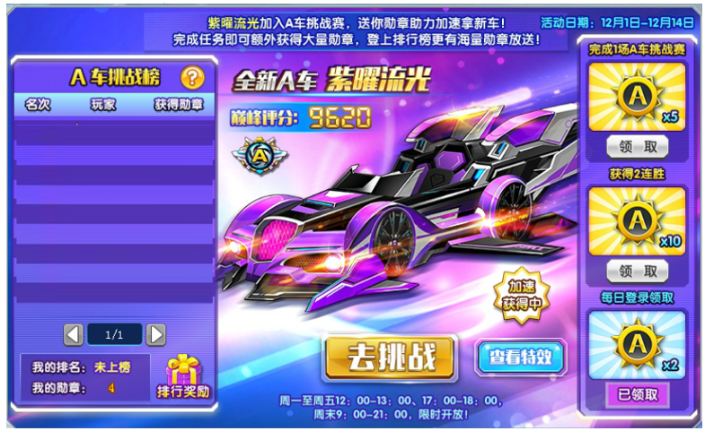 活动期间每天登陆即可领取A车勋章,完成任务更可获得大量勋章,助力加速拿A车!