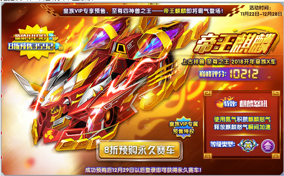 本周皇族VIP专享8折预售,成功预购12月29 后登陆即可获得永久赛车!