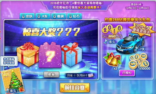 活动期间参加比赛有几率掉落揭秘卡,消耗揭秘卡即可揭晓新内容,皮肤、X车、靓装、钻石等你来探索哦!完成揭秘即可领取永久圣诞背景卡!