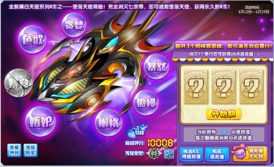 仅消耗10点拯救值,即可点击翻牌;翻出3张同样的罪恶牌,即可用神秘力量消灭1种罪恶;完全消灭七宗罪,即可拯救堕落天使获得永久新R车!
