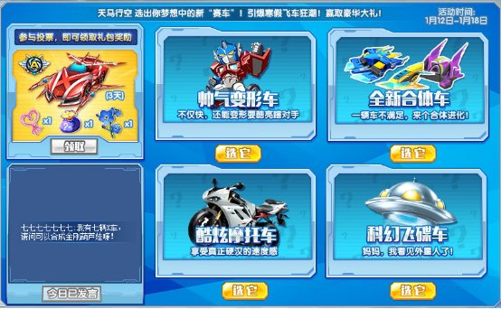 快来选出你梦想中的新“赛车”,引爆寒假飞车狂潮!天马行空任你发挥!