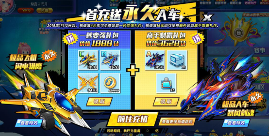 充值满4元即可领取价值1888钻1秒变强礼包,内含人气永久B车、永久C车、华丽翅膀和海量金币;