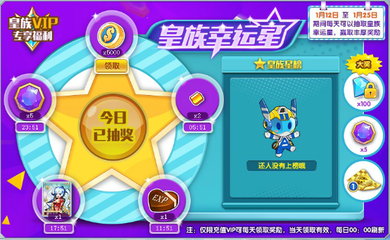 活动期间每天上线都可以幸运抽奖哦!身为皇族,每在线6分钟更可以按顺序领取所有奖励!