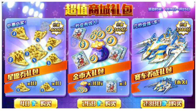 星愿券礼包、金币大礼包和赛车养成礼包为你奉上,满足多种需求!