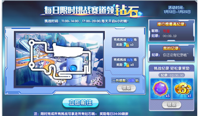 每天一张赛道,完成挑战后即可拿走所有钻石!突破指定记录还可获得额外奖励哦!