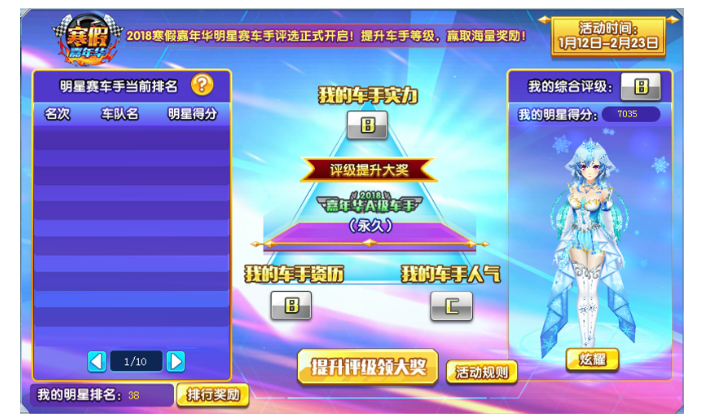 车手的实力得分、资历得分和人气的分值和构成明星得分,根据得分会对车手进行评级哦!评级提升伴有海量珍贵奖励!