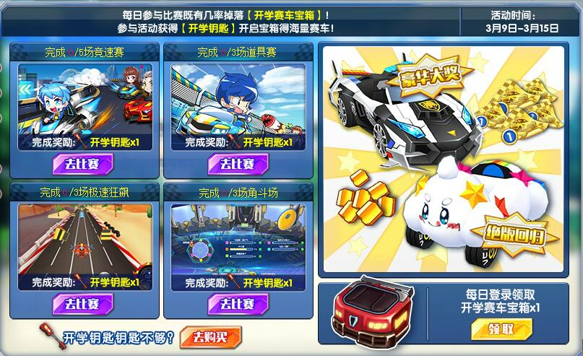 快来完成比赛,开学宝箱天天开,赢海量赛车!