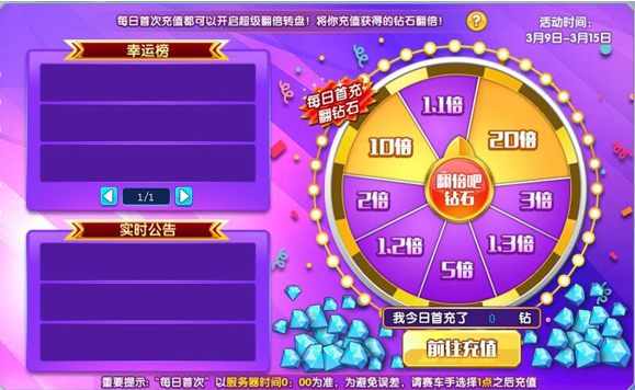 每日首次充值都可开启超级翻倍转盘!将你充值获得的钻石翻倍!