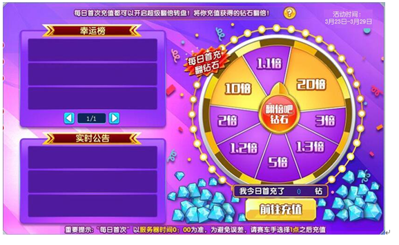每日首次充值都可开启超级翻倍转盘!将你充值获得的钻石翻倍!
