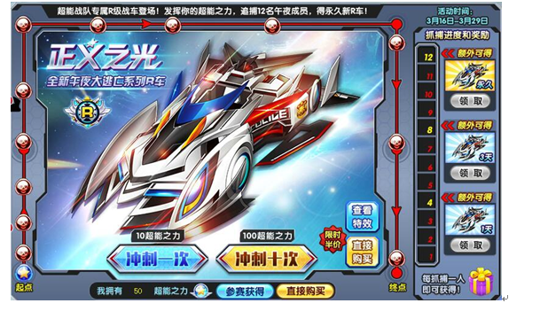 代表超能战队,消耗超能之力完成抓捕小游戏,即可获得永久新R车!