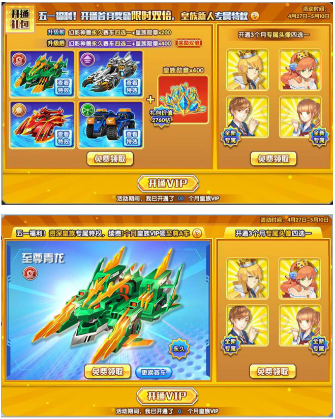 皇族新人开通VIP首月奖励限时双倍,永久幻影神兽赛车4选2!