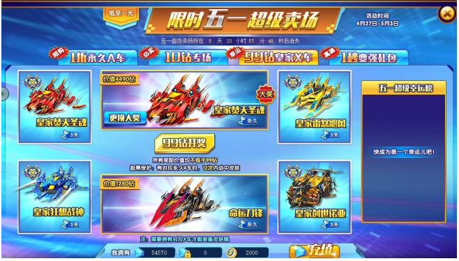欢迎来到限时五一超级卖场——99钻皇家X车限时专场!