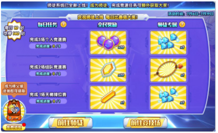 7月6日-7月19日期间,参与每日活动即可获得全民奖励;成为师徒,完成竞速任务还能额外获得师徒专属奖励。