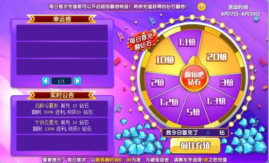 8月17日-8月30日,每日首次充值都可开启超级翻倍转盘!将你充值获得的钻石翻倍!