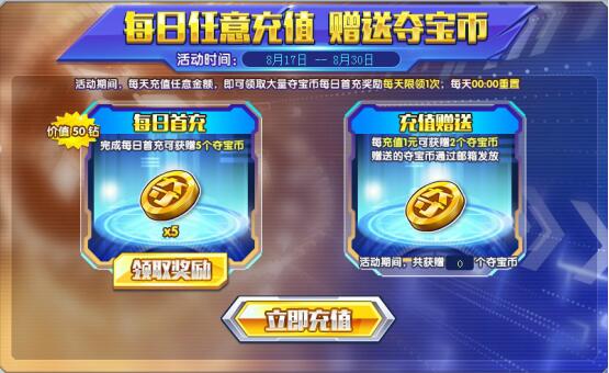 另外,在8月17日—8月30日期间,每日充值任意金额,即可领取大量夺宝币每日首充奖励,每充值1元还将获得2枚夺宝币。