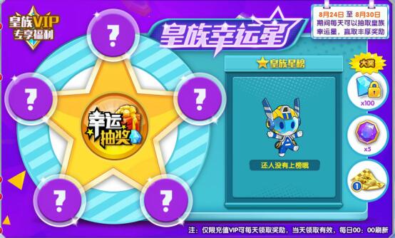 绑定钻石、至尊宝石、单次黄金零件券、赛车万能续费卡等等海量奖品尽在皇族幸运星!
