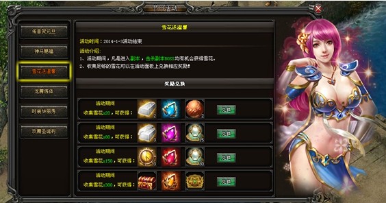 活动介绍:活动期间,凡是进入副本,击杀副本boss均有机会获得雪花。收集足够的雪花可以在活动面板上兑换相应奖励!