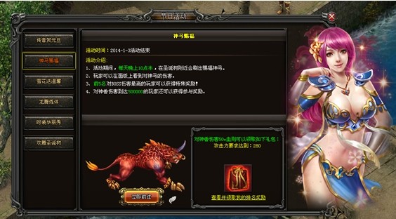 活动介绍:活动期间,每天晚上10点半,在圣诞树旁边会刷出赐福神马。玩家可以对神兽马发动攻击,系统将在计数面板上统计你对神兽造成的伤害。每晚活动结束时,对神兽伤害排行前5的玩家可以获得特殊奖励。所有对神兽伤害达到500000的玩家也能获得参与奖。