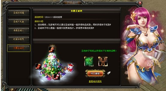 活动介绍:活动期间,玩家每天可以通过圣诞树摇一摇获得物品奖励,同时刷新圣诞袜等级,圣诞袜档次越高,可获得的奖励越丰厚!袜子奖励当日零点结算,并且重置袜子档次。