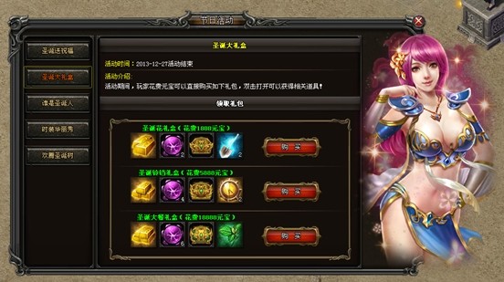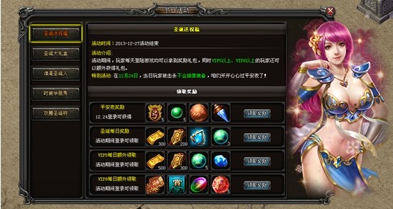 特别活动:12月24日平安夜当天,在线玩家可以获得平安夜特殊礼包,另外当天玩家被击杀不会掉落装备。