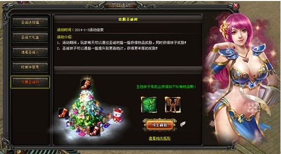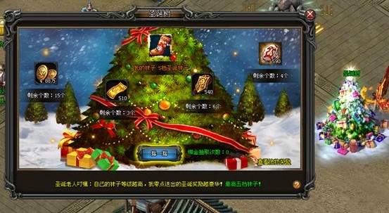 活动介绍:活动期间,玩家每天可以通过圣诞树摇一摇获得物品奖励,同时刷新圣诞袜等级,圣诞袜档次越高,可获得的奖励越丰厚!袜子奖励当日零点结算,并且重置袜子档次。