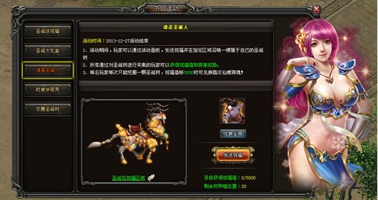 活动介绍:活动期间,玩家可以通过活动面板,发送祝福并在指定区域召唤一朵属于自己的圣诞花,玩家可以采集圣诞花,获得祝福值和惊喜奖励,每位玩家只能对同一朵圣诞花采集一次。祝福达到5000后可获得踏云仙鹿骑魂一个。