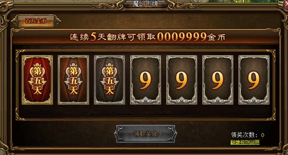 每日翻牌送海量金币!该活动将于玩家1转后开启。每天首次登陆后可翻开一张卡牌(由低位到高位)至少翻开个位至万位的5张卡牌后,方可领取卡牌上数字所组成数额的金币。每次领奖都会消耗领奖次数,领奖次数可通过转生获得。