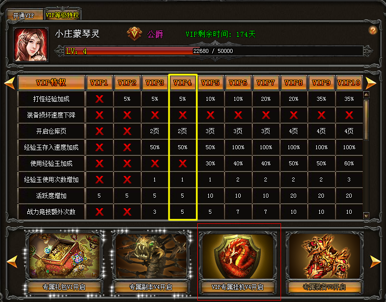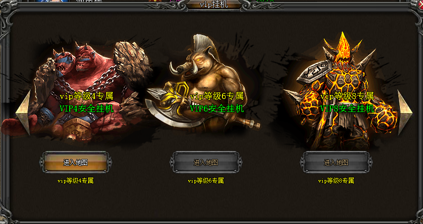 VIP4以上玩家可以根据自己的VIP等级每日00:00-08:00进入指定地图安全挂机刷怪。