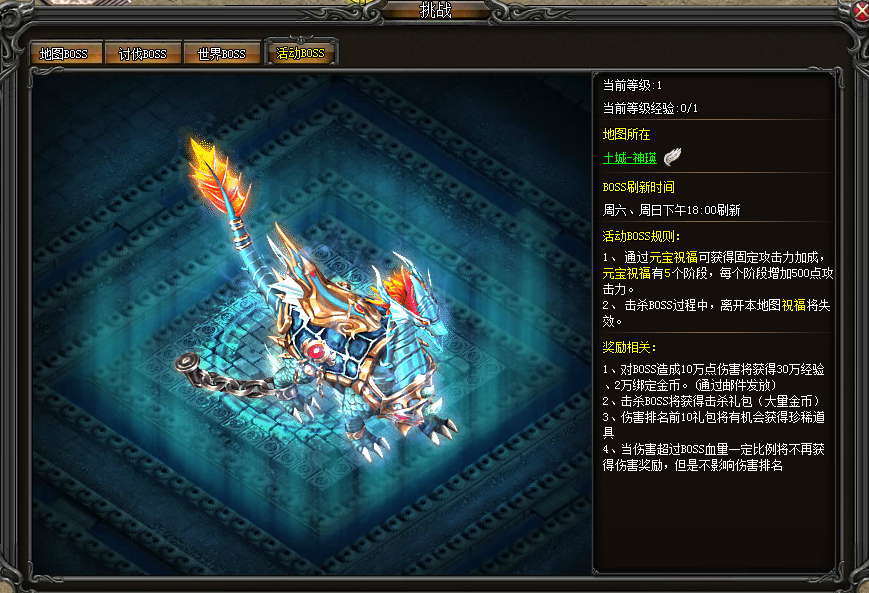 玩家可以在土城NPC神瑛处进入活动地图。每逢周六周日下午18:00刷新BOSS,玩家可以根据对BOSS造成的伤害获得奖励,伤害前十名玩家有特殊奖励。玩家可以使用元宝获得攻击力祝福,最多可提升5个阶段,在BOSS战时临时增加500点攻击力。