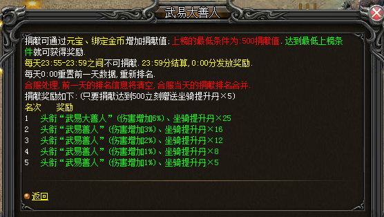 2、 武易大善人NPC每日捐献排行榜说明增加奖励描述,描述更直观;