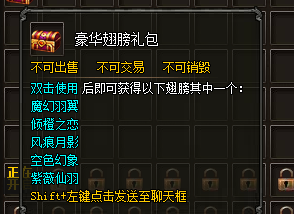 礼包内容:豪华翅膀礼包*1、升华结晶*40、黄金锄头*10、武魂经验丹(小) *15、强效修为丹*30、红玉石*80、转生灵魄令*3、究极金砖*1.