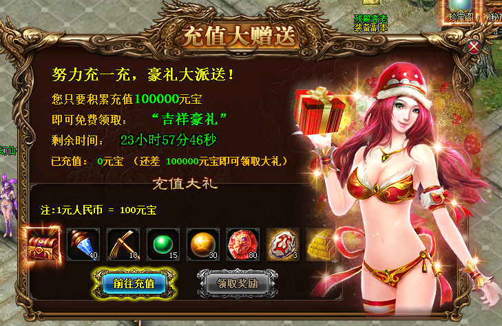 努力冲一冲,豪礼大派送,只要在活动期间累计充值达到100000元宝,即可领取“豪华翅膀礼包”及大量稀有道具!