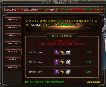 活动内容:百服活动期间,每天都会有不同的战力目标,只要当天战力达到目标数值即可获得相应奖励。活动结束后,战力达到30000以上,且战力最高的人可获得完美.屠龙和永久拥有百服第一战神绝版头衔!
