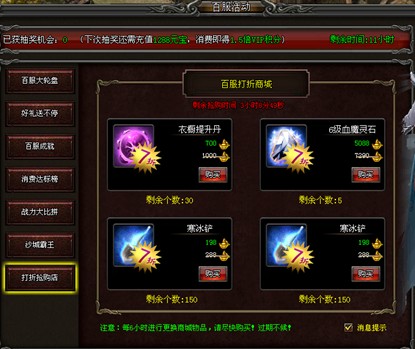 活动内容:百服期间,全民让利大活动,全民共享!大家乐才是真的乐!玩家们可以在百服打折商城中限时抢购各种低价商品。上架商品定时刷新,一起来淘你喜欢吧。