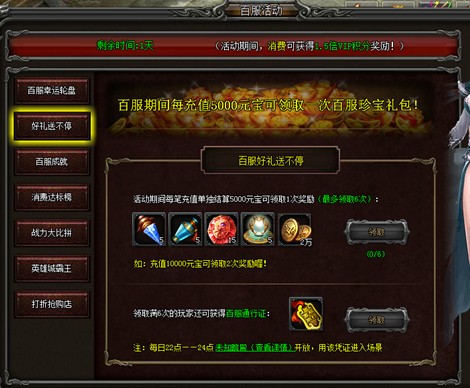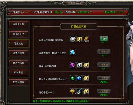 活动内容:百服活动期间,每天都会有不同的消费目标,只要消费达到目标金额即可获得相应奖励。活动结束后,累计消费达到100000元宝以上,且消费最高的玩家可获得屠龙装备碎片和永久拥有百服大亨绝版头衔!