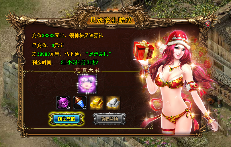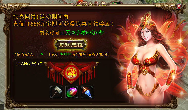 活动简介:活动期间,累计充值达38888元宝,即可领取活动礼包。