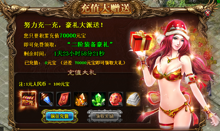 活动奖励:累计充值70000元宝即可获赠豪华翅膀礼包*1、升华结晶*50、10级完美强化符*1、二级金刚石*30、三级金刚石*15、红玉石*70、究极金砖*1。
