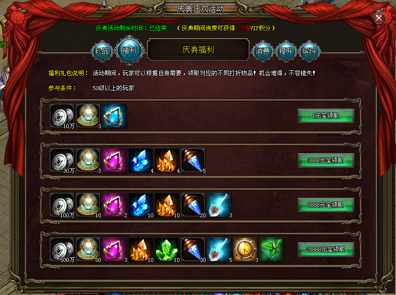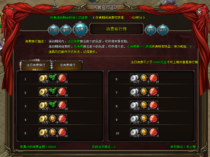 参与方法:活动时间,玩家达到指定的消费金额后,可获得系统送出的珍稀物品!可实时在面板查看到排名!