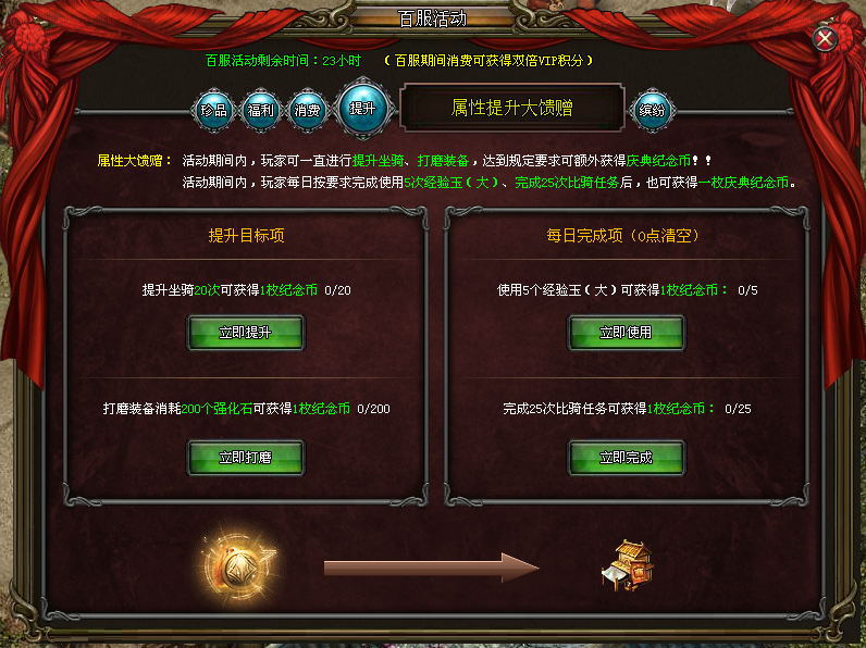 参与方法:活动时间,只有根据要求提升自身属性,则可以获得纪念币!纪念币可兑换庆典特有物品哦!