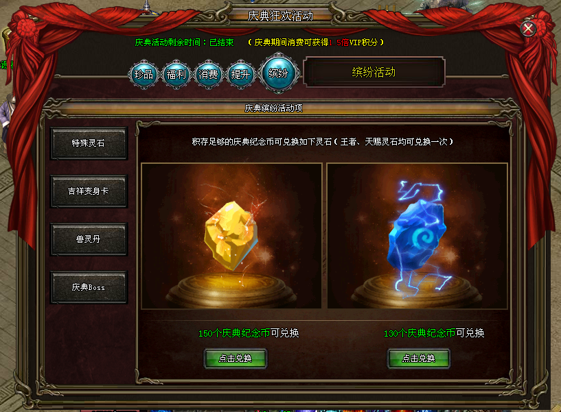 活动介绍:狂欢庆典活动期间,玩家可以收集庆典纪念币,然后在面板进行兑换!有特殊的灵石,变身卡,和转生灵魄丹只有在活动期间才有哦!同时,如果本服玩家的连连分数到达一定值后,则可以召唤出吉祥物,每天晚上10点在比骑城出现,为大家送上祝福!