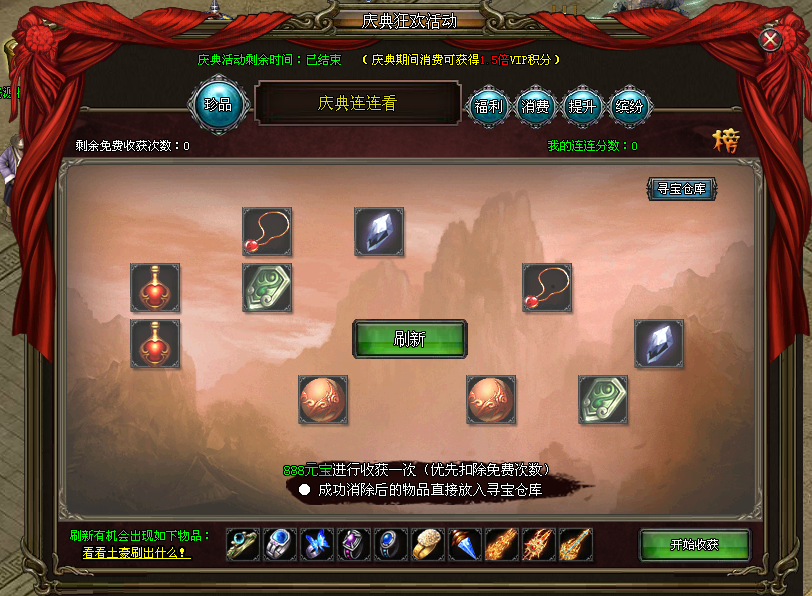 活动介绍:想要高级的珍品装备和特殊物品吗?动起你的手指,进行庆典连连看消除小游戏!消除到的物品就是你的罗!